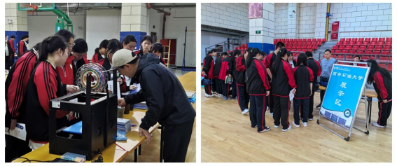 姜国平、实验室管理处贺刚两位老师将携带的富有学校学科、科研特色的3D打印机、岩心标本、原油标本、煤样标本等展品展示在科技节展会现场。同学们对参展作品十分感兴趣,对展品的工作原理、获取来源、实际用途等问题进行询问,两位老师现场给同学们进行了详细讲解。