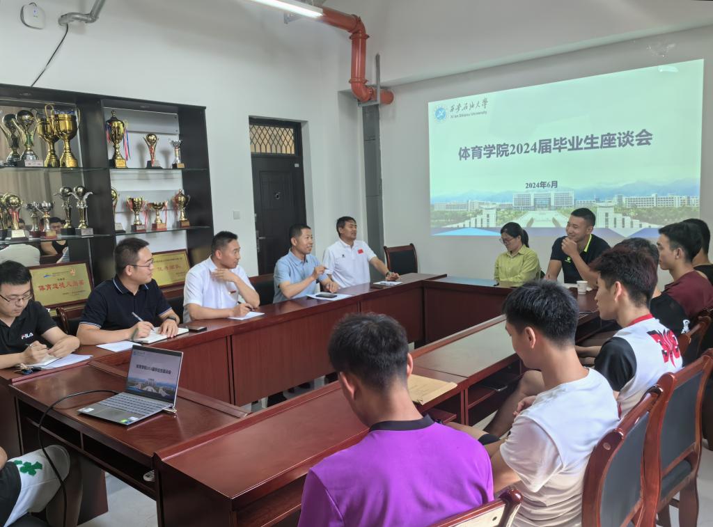 党总支书记苟毅飞、院长李寿邦、社会体育指导与管理专业教研室主任胥山、学生工作办公室主任焦龙、辅导员张泽正及2024届全体毕业生参加座谈会。会议由学生工作办公室主任焦龙主持。