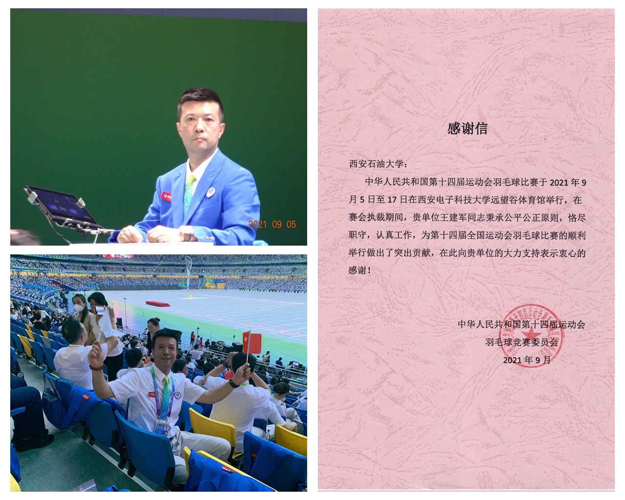 “能够作为国派技术官员参加十四运的羽毛球执裁工作,非常荣幸也很激动。参加全运会不仅仅代表个人,同时更代表着陕西和西石油的形象。严肃、认真、公平、公正履行裁判员的职责,微笑、服务体现东道主的热情。我会继续追求卓越,不忘初心,发扬西石大精神,秉承西石大作风,更加努力的做好本职工作。”