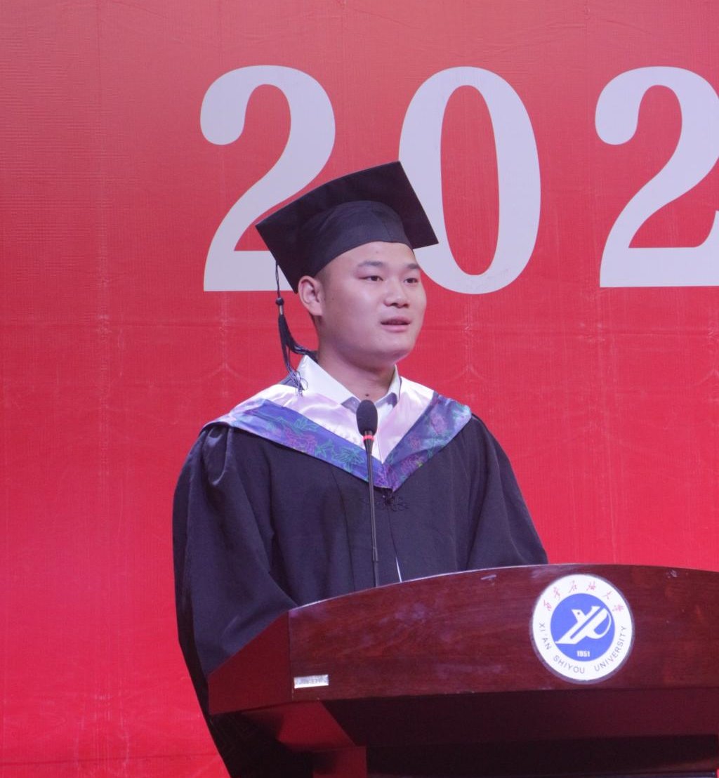 社体1701班廖进洋同学作为我系2021届学士学位获得者代表发言,首先,他代表我系全体本科毕业生们向多年来给予辛勤教诲的各位老师致以衷心的感谢和崇高的敬意。随后,他回首了大学四年的点点滴滴,回顾了同学们把青春的激情和求知的欲望尽情挥洒在这片美丽的校园的那些日子。最后,他表示,四年大学生活给予我们的,不仅是知识和能力,更是价值与情怀。走出校园,哪里有我们,哪里就有“好学力行,自强不息”的精神,2021届毕业生将不忘母校教诲,团结勤奋、求是创新,努力作一个有责任心的人,以优秀的成绩回馈母校的培育之情。